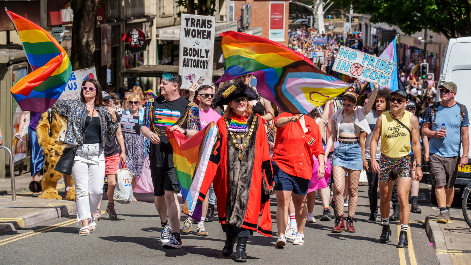 Beginning at Castle Park and winding through the centre until reaching Lloyds Amphitheatre, thousands of revellers waved flags and held placards celebrating queerness.