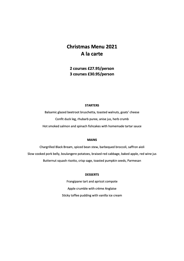 Christmas à la carte: 2 courses £27.95. 3 courses £30.95