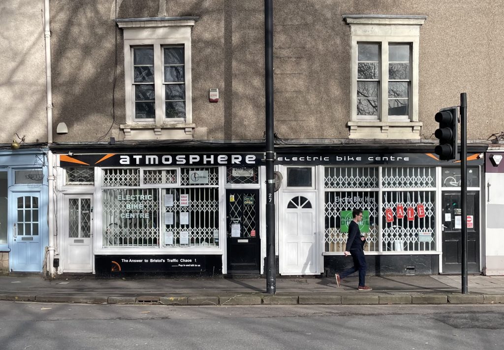 A notice in the shop window says: “To all our customers: Atmosphere Electric Bikes Ltd has now ceased trading due to challenging trading times.