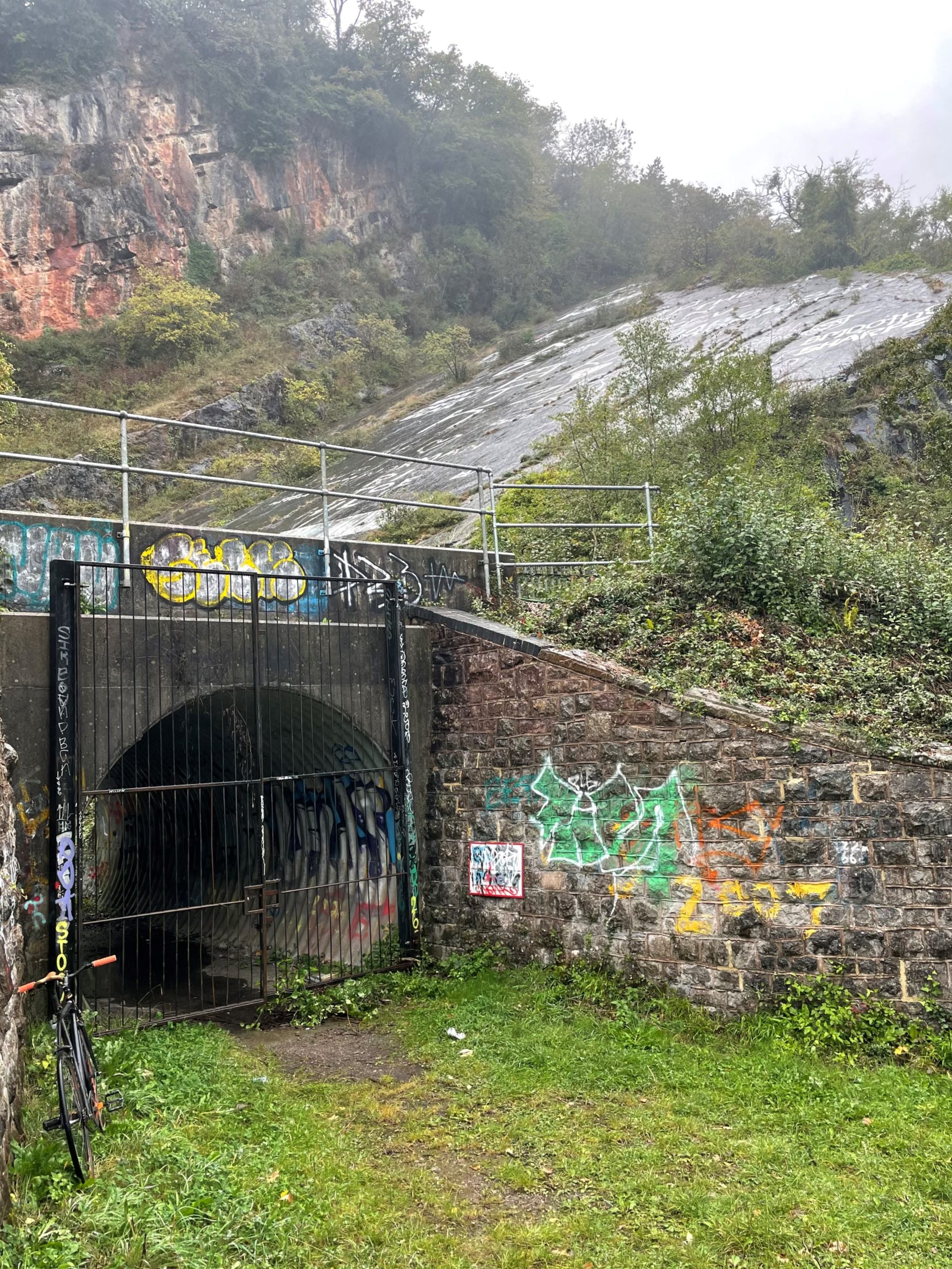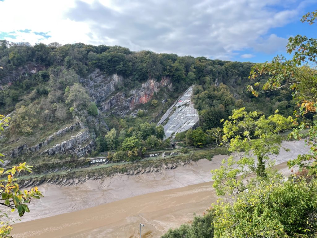 The slab is located at the bottom of Leigh Woods and is accessed through a small tunnel underneath the railway line adjacent to the Pill Path on the other side of the Avon Gorge from the Portway.