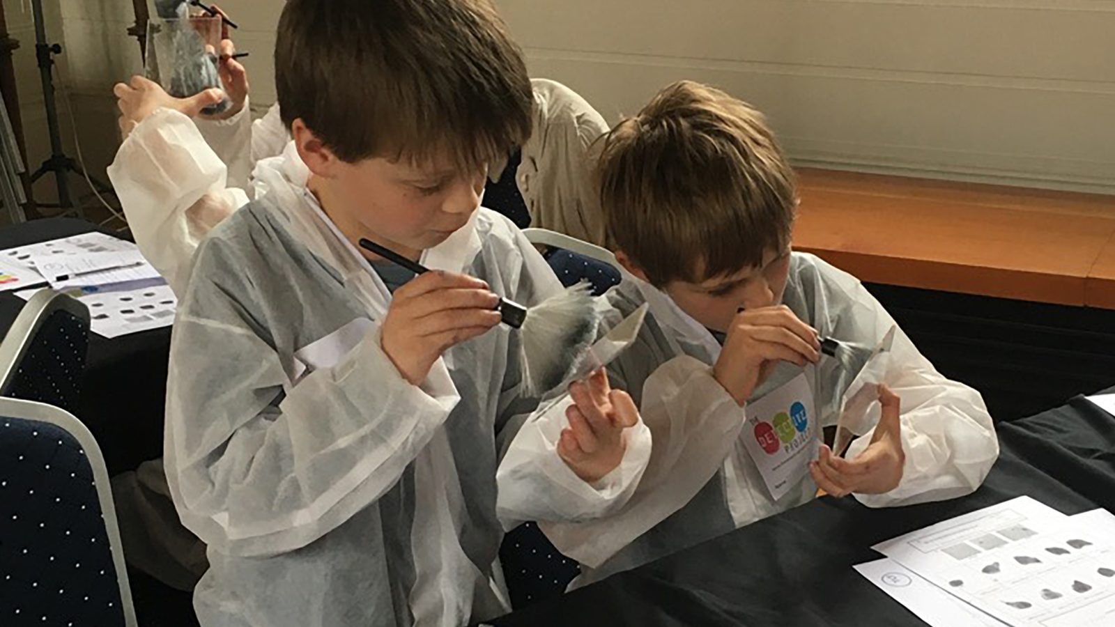 Dressed in white forensic over suits and tightly clutching a magnifying glass each, they peer at the skull, fascinated, and pick up possible evidence with tweezers to avoid contamination. All initial fear of the skeleton on the floor is now forgotten as they focus on the serious task of looking for clues and solving the crime at hand.
