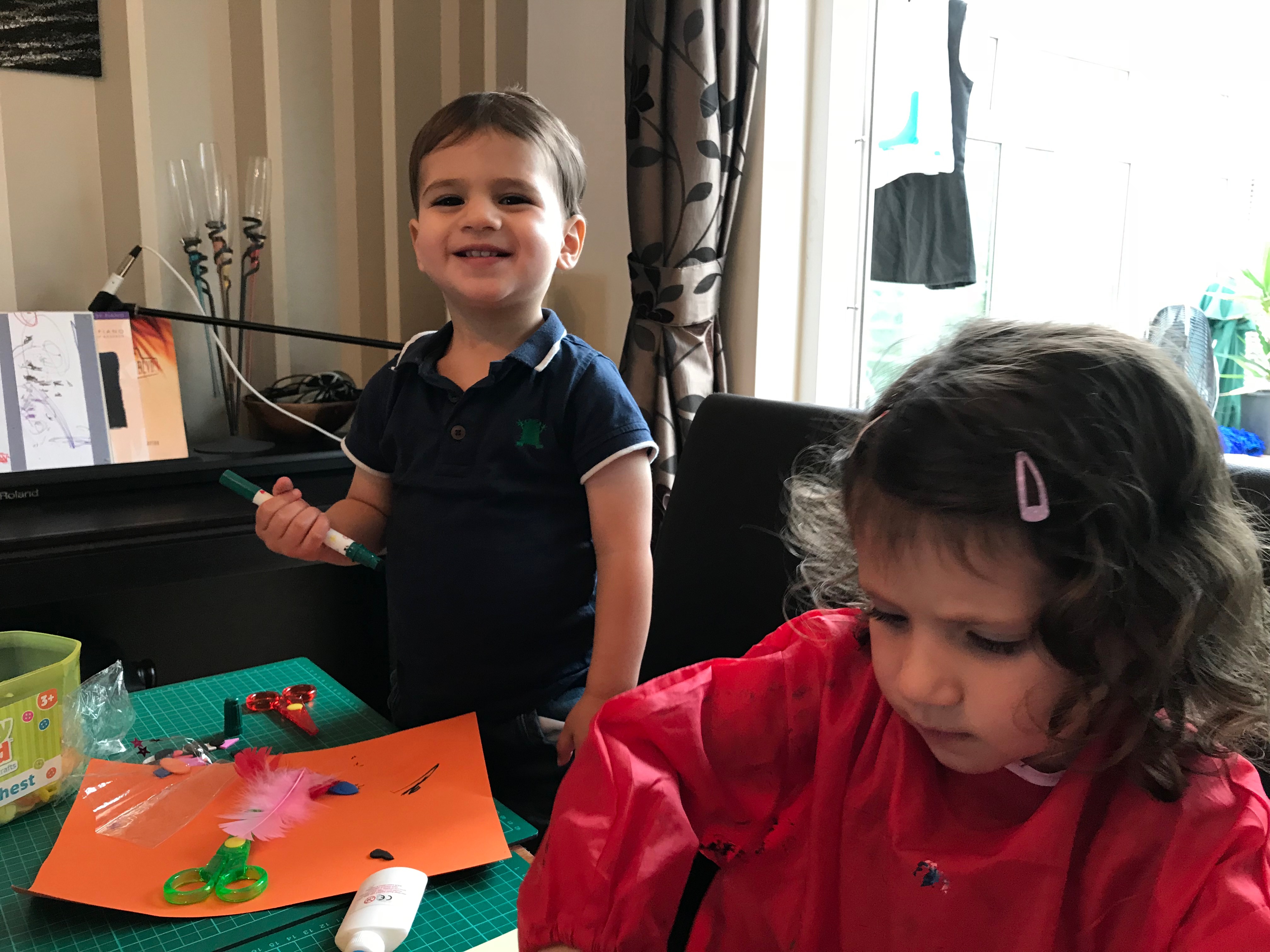I often resort to my craft box: a strong plastic bag that has bits and pieces that I’ve acquired from very cheap shops. My children love cutting, sticking and drawing and they’re not particularly bothered whether it results in anything as long as they’re getting stuck in.
