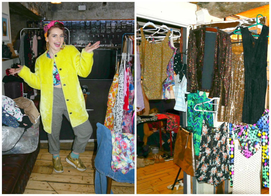 The space was filled from every possible hook, picture rail and shelf, with everything from vintage garms, retro sportswear, faux-fur jackets, handmade pieces, sparkly garms, nearly-new shoes, bags, costume jewellery and hats. Each seller had a rail and a table to,p and decorated their space with their pre-loved collections, displayed with twinkling fairy lights. There were garments from so may eras from 1950s dresses to 80s sportswear, vintage scarves and handmade contemporary pieces. It was a veritable fashion-lover’s paradise.