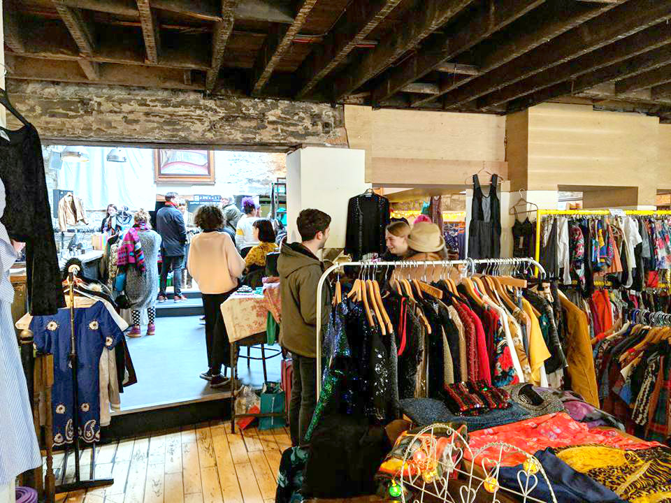 The space was filled from every possible hook, picture rail and shelf, with everything from vintage garms, retro sportswear, faux-fur jackets, handmade pieces, sparkly garms, nearly-new shoes, bags, costume jewellery and hats. Each seller had a rail and a table to,p and decorated their space with their pre-loved collections, displayed with twinkling fairy lights. There were garments from so may eras from 1950s dresses to 80s sportswear, vintage scarves and handmade contemporary pieces. It was a veritable fashion-lover’s paradise.