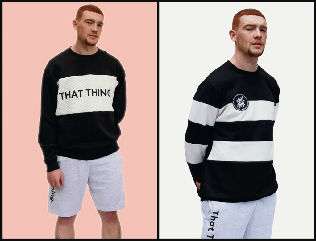 Stay monochrome cool in this quilted panel unisex sweatshirt and keep a contemporary street style edge with this striped sweatshirt , by That Thing – £38. Available from www.thatthing.co.