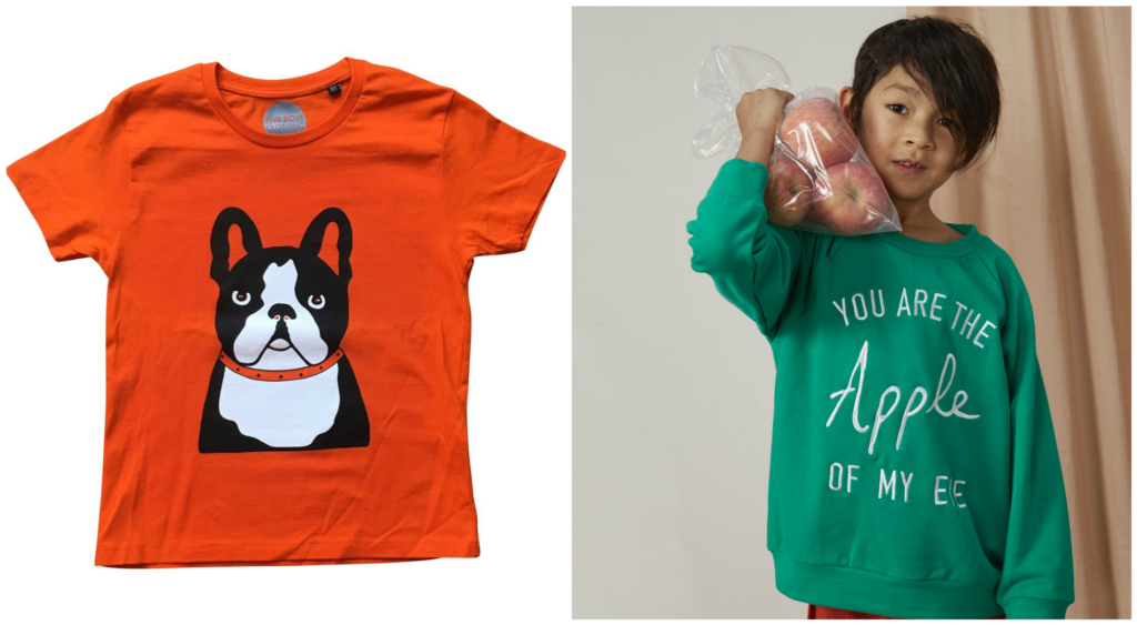 Orange French Bull dog organic T-shirt (£15) and Milk and Biscuits embroidered sweatshirt (£45)