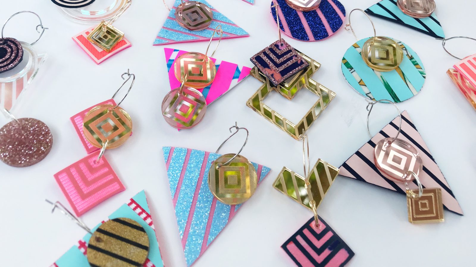 “Rosa came up with the genius idea of threading small clusters of our unused, vinyl printed shapes and laser cut components on to wire earring hoops, creating our mix and match charm earrings.