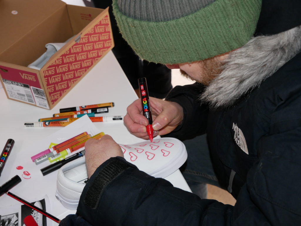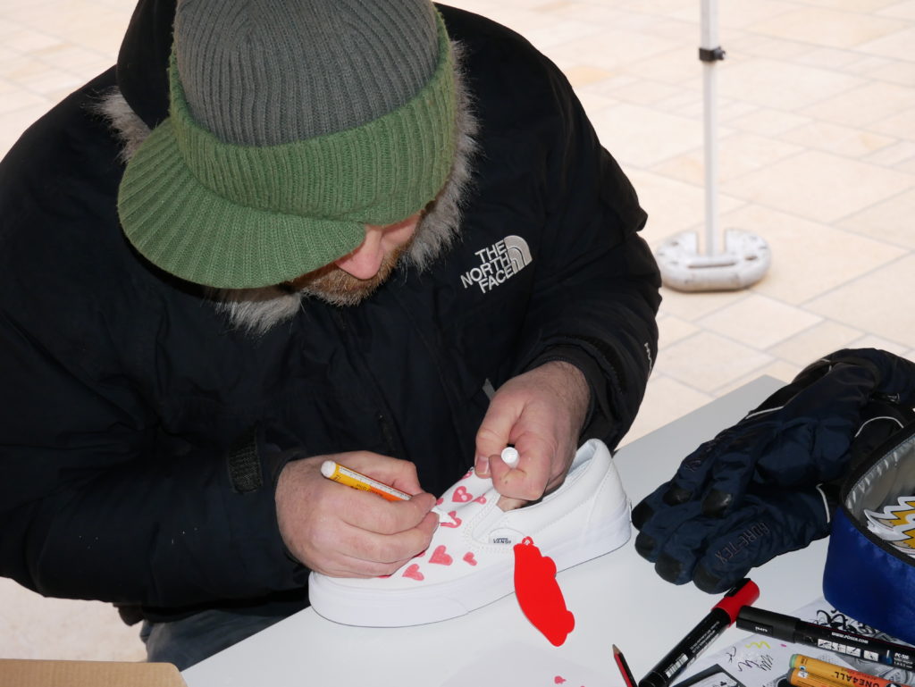 Sat at the Superdoodle shoe box table – itself creatively customised – Rory seemed very happy to recreate designs onto the trainers. Using graffiti pens he would draw freehand onto the shoes, checking with the owner of the trainers that the design was to their liking. Despite the freezing cold weather Rory was enthusiastically customising away, happy to recreate all the design requests he could.