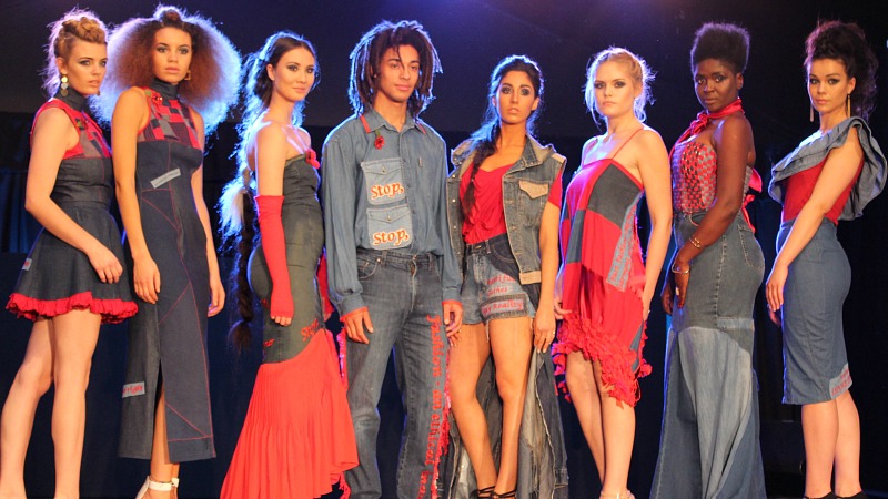 The show ended with a moving speech on the staggering figures of textile waste by Aimee Campanella from Bristol Textile Recyclers (BTR), who divert 20 tonnes of clothing from landfill sites every day. Using denim and red cotton from their stores of recycled textiles, BTR showed a capsule collection (see header image) bearing powerful messages sewn across the garments such as ‘stop, think, question’.