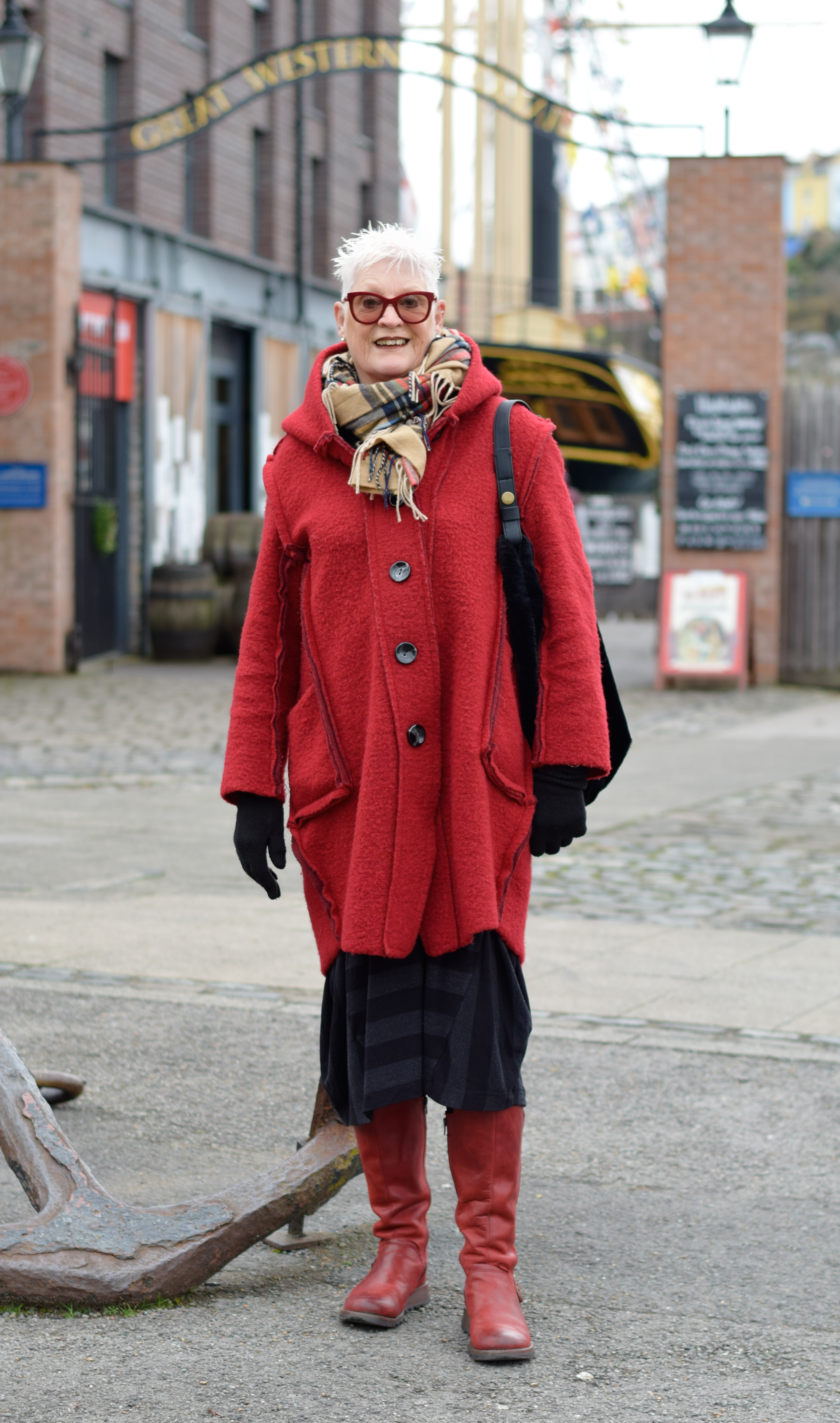 What are you wearing? Coat from Portabella, a shop in Clifton. Skirt from Jigsaw and my shoes are from Fly. Glasses are Issey Miyake.