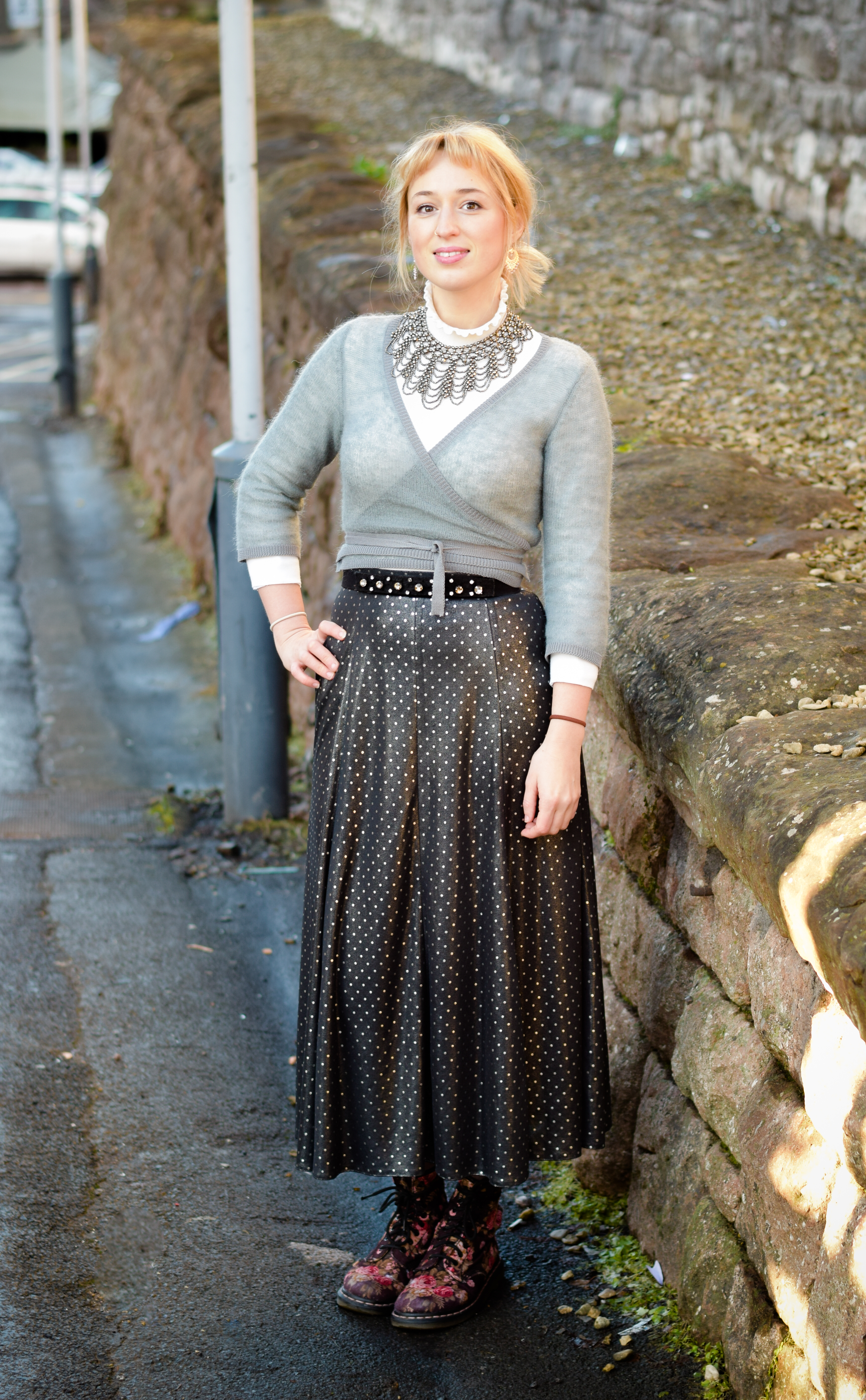 What are you wearing? The skirt was a mega-bargain from Urban Fox and I feel like a disco ball whenever I wear it! The cardigan is from a charity shop, the polo-neck is a much loved hand-me-down from my auntie Joy, and my feet are never without my Doc Martens.