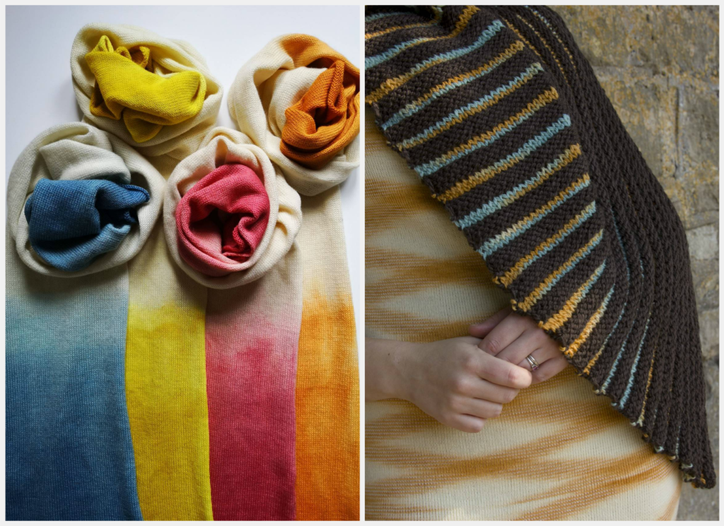 Left: Ombre scarves (£50) are machine-knitted before being dip-dyed by hand. Right: fine-knit dress and brown stripe wrap dyed from walnuts, both from Ria’s master’s collection