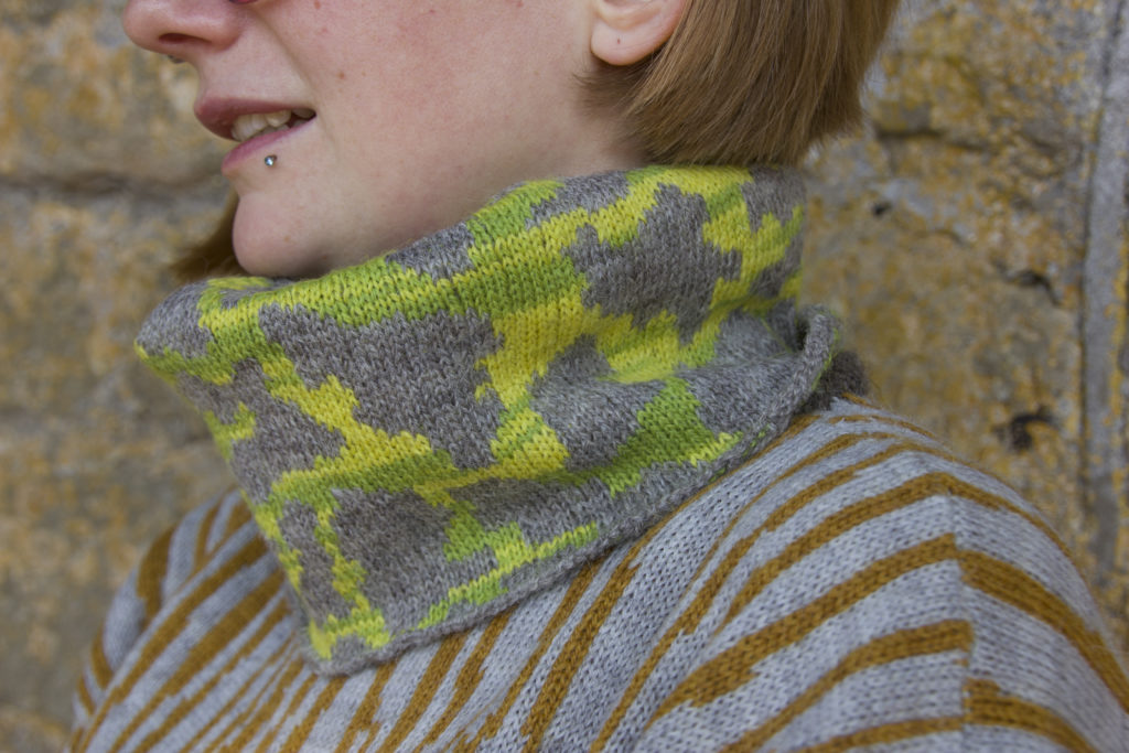 The Caloplaca cowl (£40) is dyed with weld for the yellow colourway then over-dyed with indigo to give the bright green. The dark grey is the natural colour of the wool.