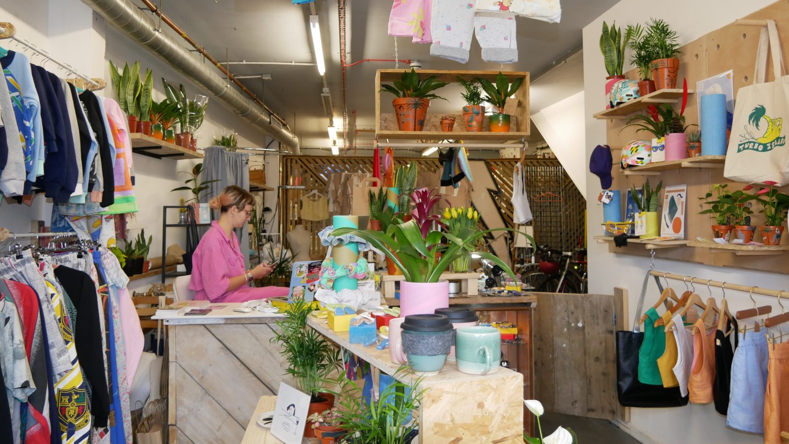 Pastel and earthy linen co-ords by Palace Flophouse sit with homewares, cycle helmets and plants from independent businesses