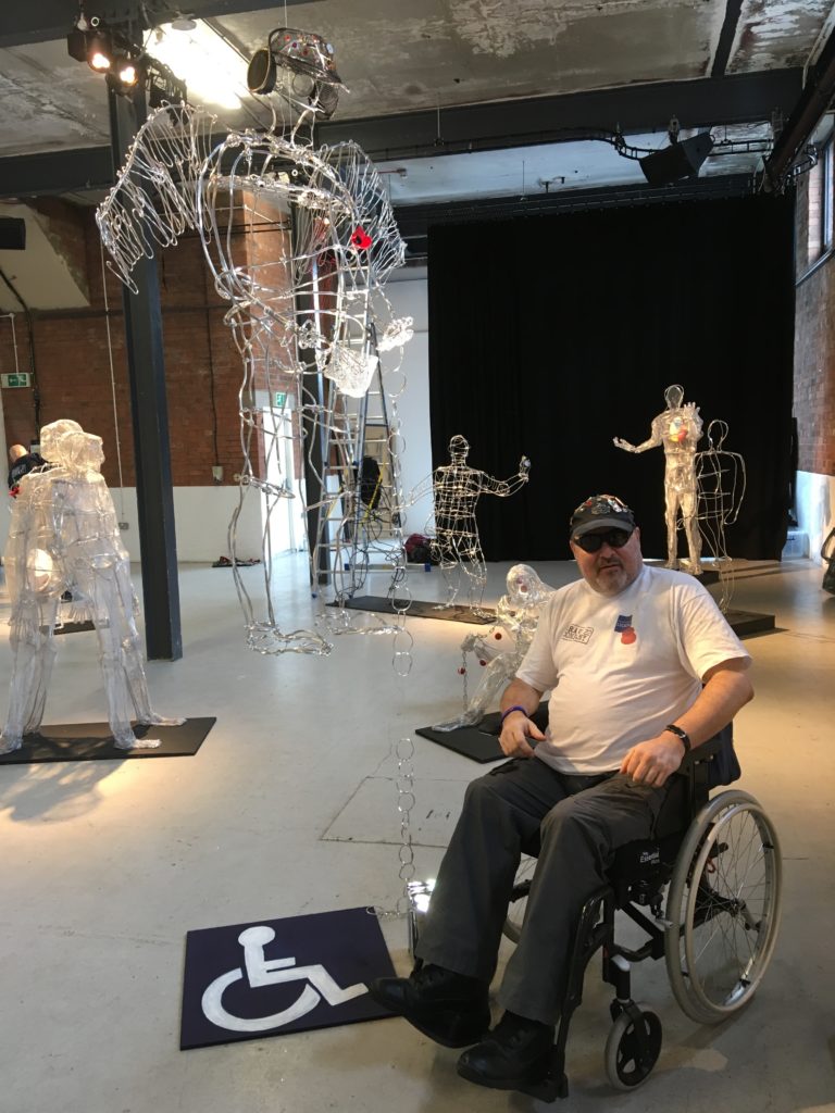 Paw Watts and his wife and full-time carer Cheryl, who live in Yate, both have sculptures in the exhibition. Paw had left the army by the time he and Cheryl met, but his health issues didn’t begin until after they were married and had two children. His diabetes affects his mobility and his sight, and his sculpture shows him rising from the confines of his wheelchair to the freedom he craves. Cheryl’s sculpture depicts her juggling the many tasks she has as a carer, while inside a huge heart is hugged by wire figures representing her children.