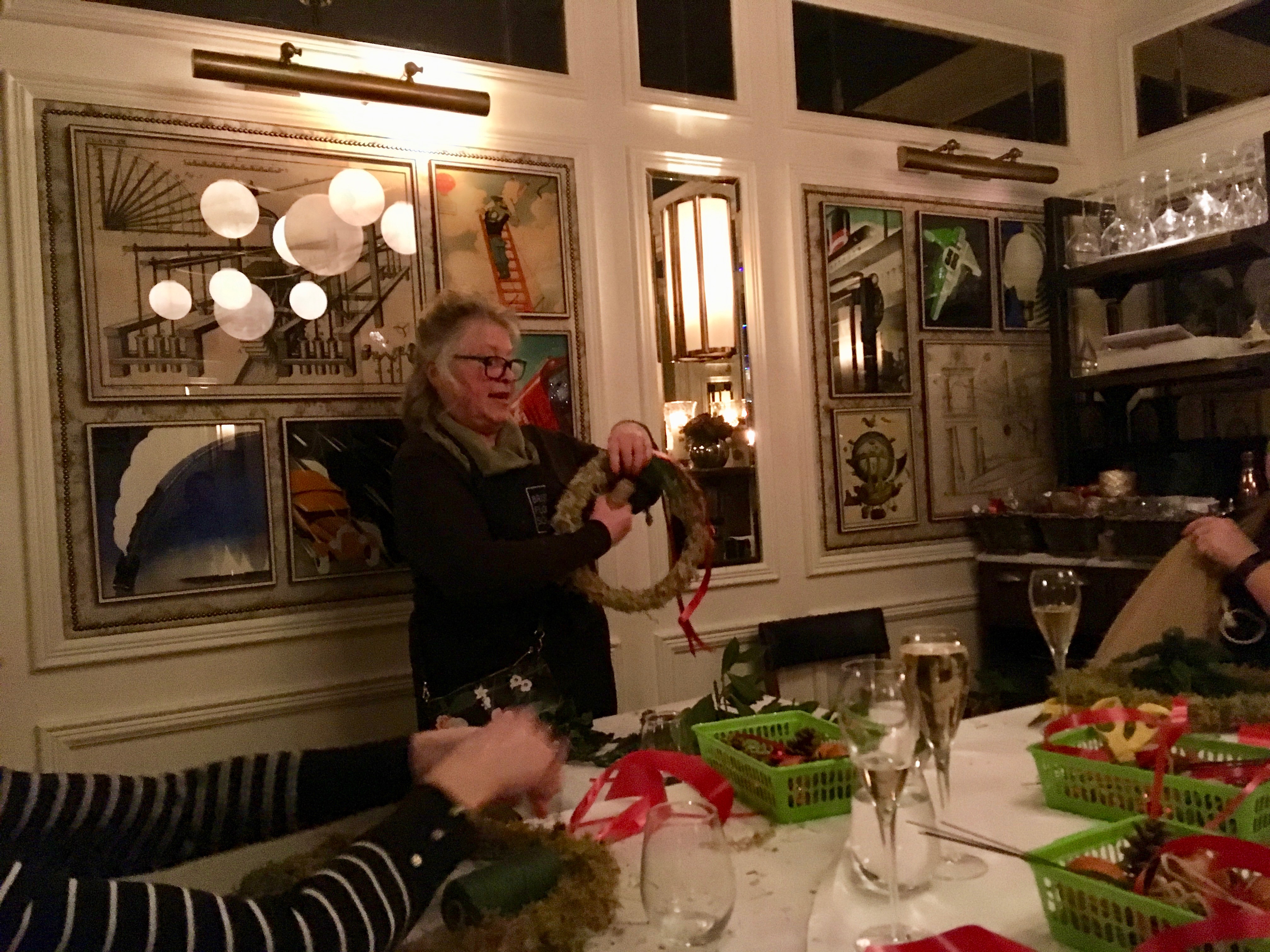 In an opulently-decorated back room with marble finishes and two mid-century modern chandeliers, Jill and Sarah Woodall from Bristol Flower School greet everyone and invite us to take a seat around the big central table, a basket of tools and equipment in front of each place setting. We’re not here for dinner, though we can hear the tinkling laugh of the diners next door, and delicious canapés keep appearing in front of us, along with a flute of champagne each. We’re here for the serious business of making a Christmas wreath.