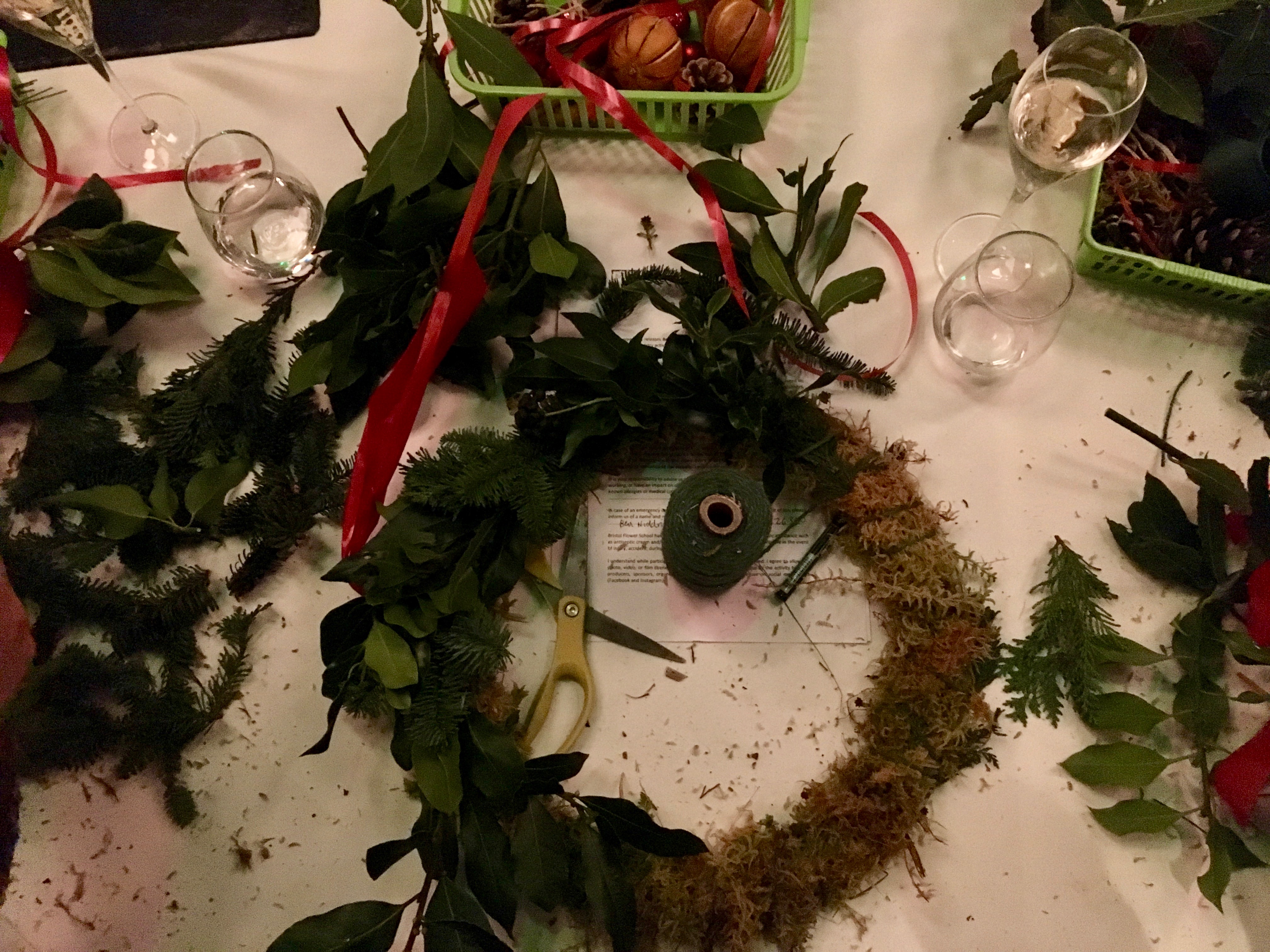 With soft jazz on in the background, and the soft pop of another champagne bottle being expertly opened, we flesh out the first layer of the wreath with cool, damp moss. A man at the end of the table finishes shaping his moss way before the rest of us. “I’ve found my niche! This is what I was born to do!” he exclaims, and his friend looks up with surprise. “You’re done already?” she says as the rest of us struggle. “You’re a ninja!”