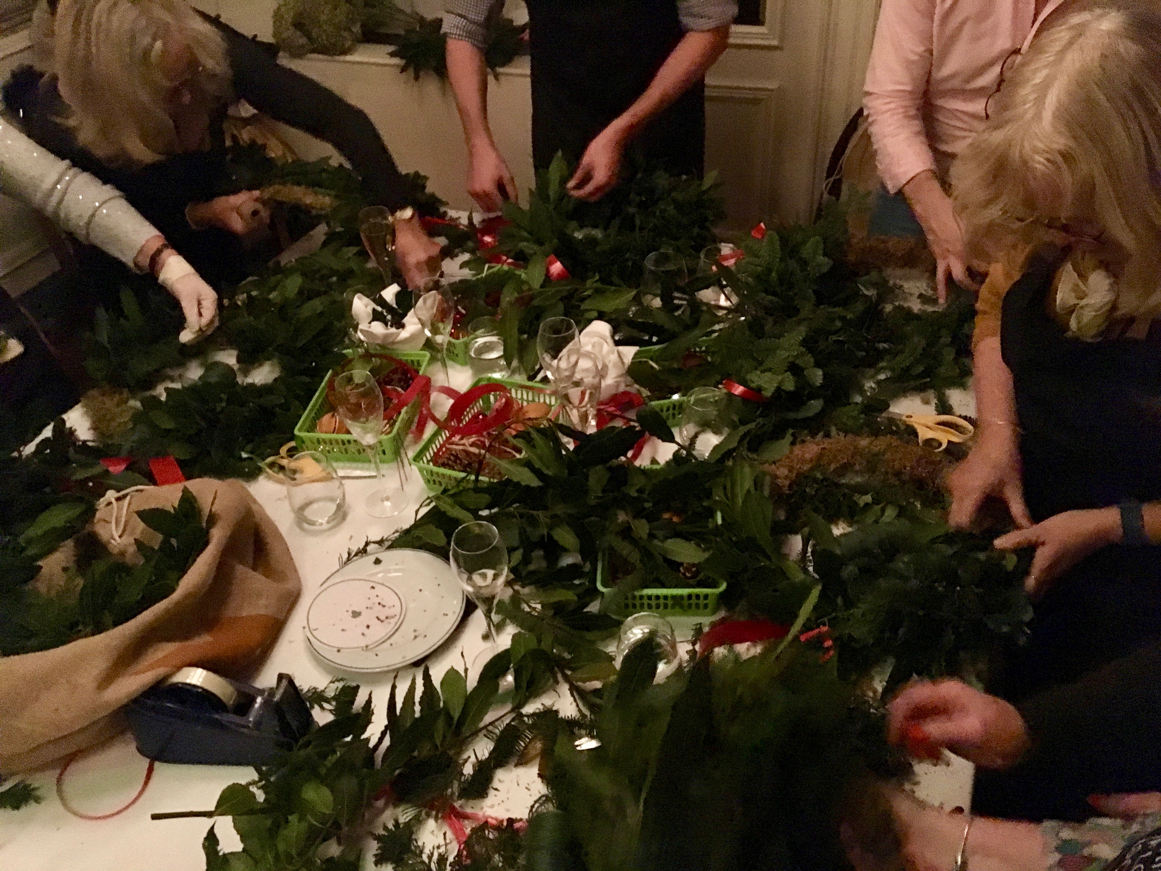 As the main bulk of the foliage is added in, there are pine needles all over the crisp white tablecloth and snipped pieces of string everywhere. “We did warn them we’d make a mess!” laughs Sarah as she salvages wreath after wreath with good suggestions for holly placement – obeying the Fibonacci sequence of thirds and fifths. There’s certainly more to this wreath-making malarky than meets the eye.