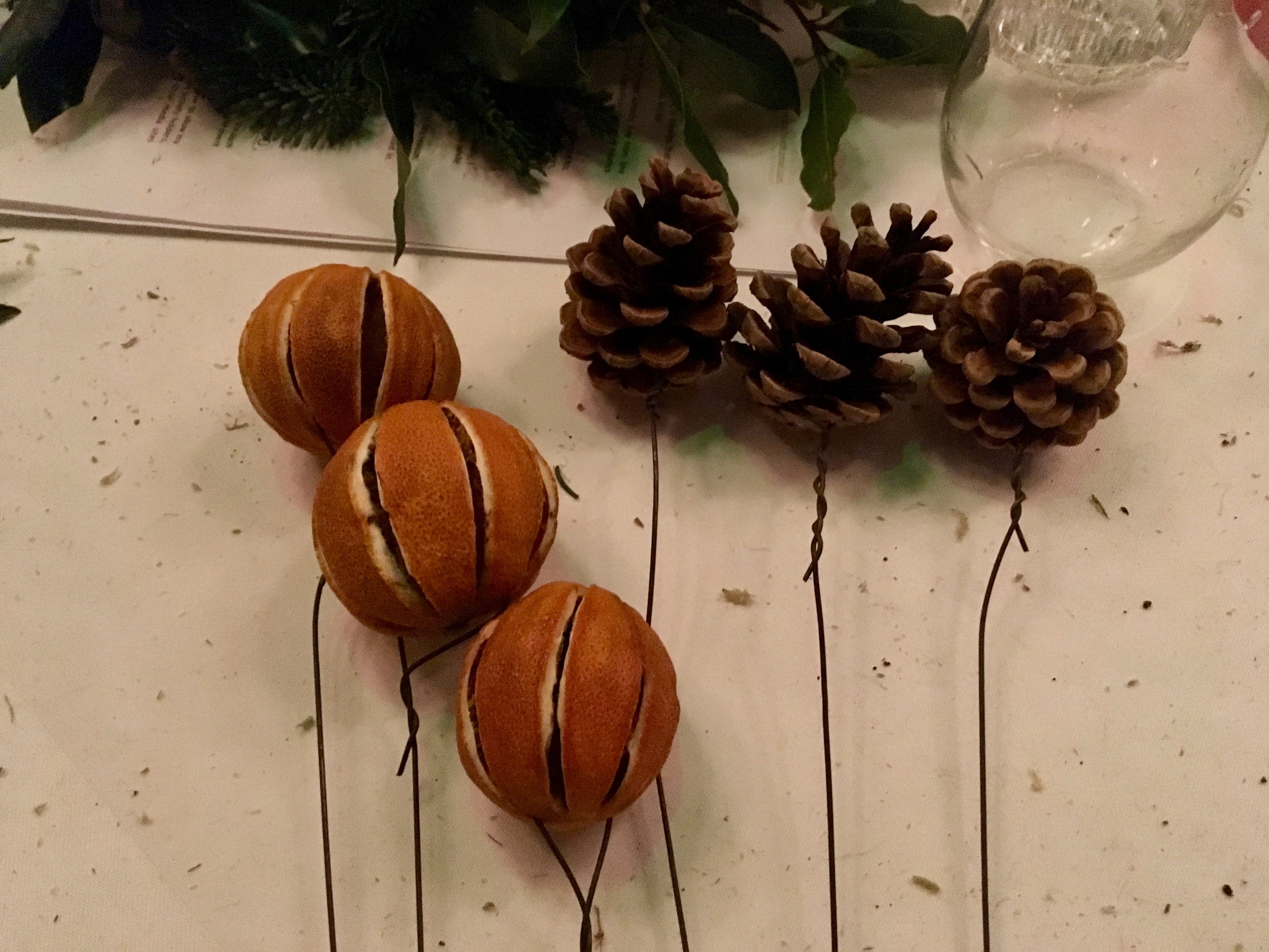 Working with our hands is enjoyable, and touching all the natural materials is making us all happy, relaxed and chatty – and the champagne is probably helping too. As a final touch, we pierce dried oranges that smell beautiful, wrap wire around a trio of pine cones, and create sweet-smelling parcels of cinnamon, bound with raffia.