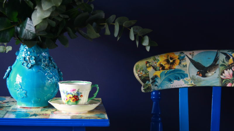 For a simple yet stunning effect, try decoupage. It may sound fancy but it’s actually easy to do. Simply cover your surface with thin pieces of coloured paper, then seal it with varnish for a paint-like finish.