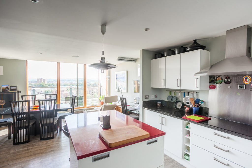 “Ashton Court, the harbourside, Leigh Woods and Brandon Hill are all within 20 minutes’ walk, which means Dexter the dog gets a great choice of walks,” Dave says. In the other direction, as viewed from the spectacular floor-to-ceiling windows of the living room and the open plan kitchen/diner a floor below, the southern hills of Dundry, crowned by the silhouette of the tall church tower, seem close enough to touch.