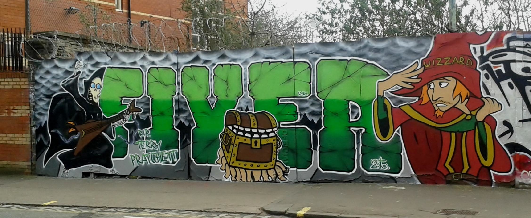 In the month following his death, graffiti of the author was painted in Stokes Croft. The street art, by the artist Fiver, featured the Discworld characters Rincewind, Death and the Luggage.