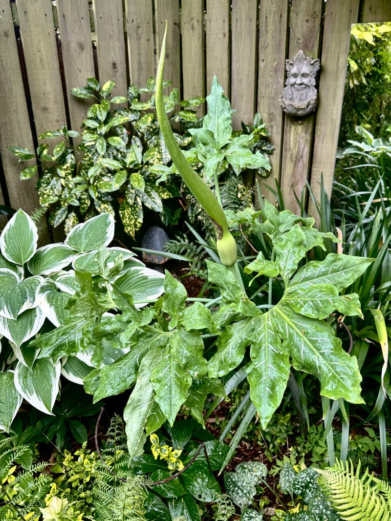 Continuing the theme, I’d be remiss to not mention the Dragon Arum sitting in the back of the garden. The exotic plant has been a staple feature of the garden for many years with its purple spotted stems.