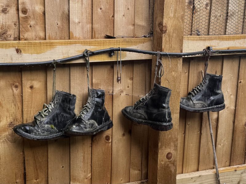 Pat’s adult sons’ old Doc Martin boots line the fence.