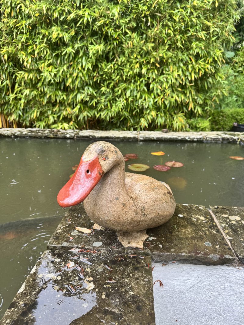 A duck presides over the Koi pond and ill-behaved fish – photo: Hannah Massoudi