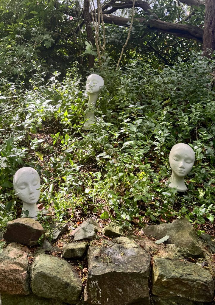 The make believe continues; littered through the woodland like garden are obscure objects like mini doors, a pair of stone rabbits, mannequin limbs, a glitter ball and a pile of rocks that look eerily like something has been buried.
