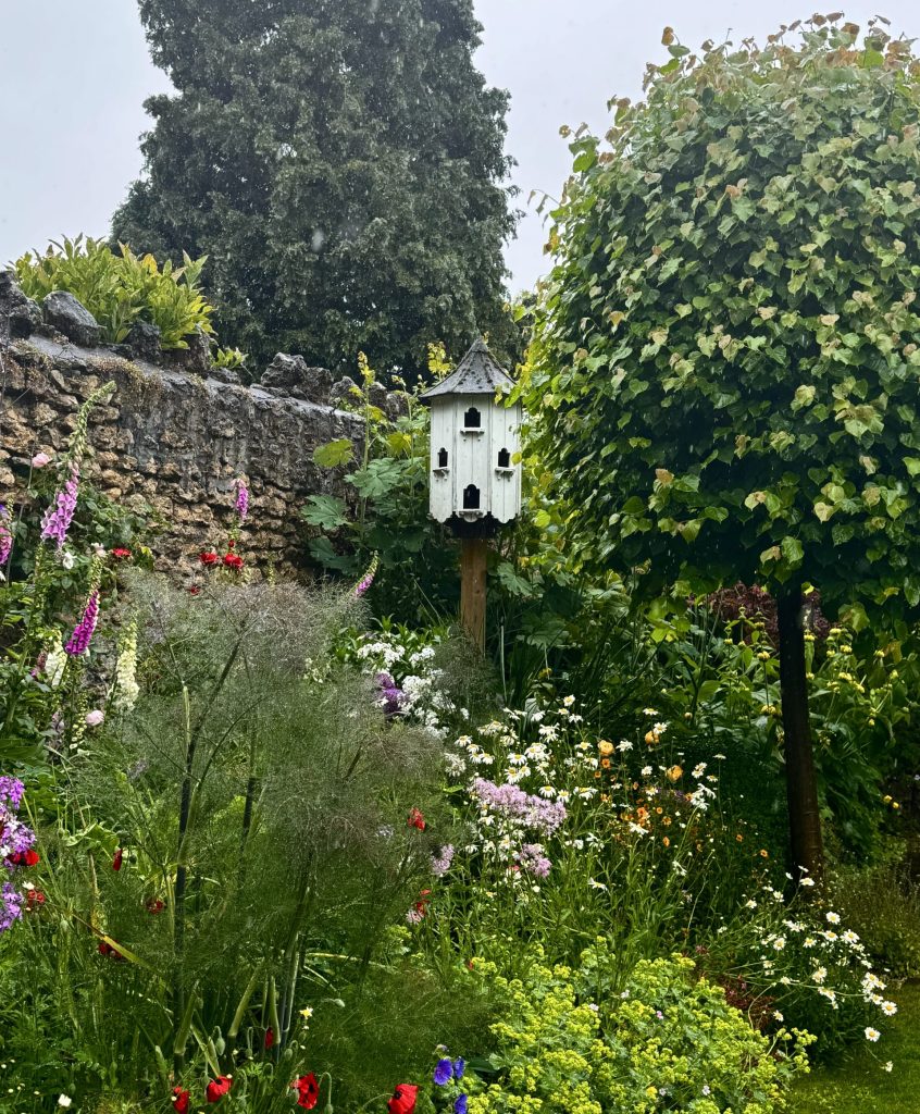 The rows of mixed flowers are surrounded by a large stone wall, with a multi-room bird house rising above them.