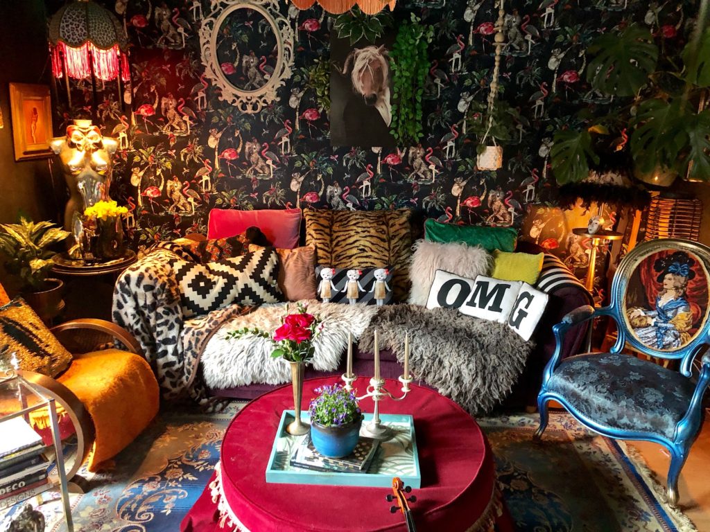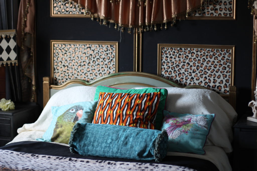 The whole house revels in Marcie’s busy eclectic style, from the palm frond wallpaper on the upstairs landing that covers all the internal doors as well as part of an enormous wardrobe that holds Marcie’s stock of fabric offcuts, to the old sliding doors behind her bed that create a spectacular ceiling-height headboard, picked out in gold and with leopard print panels overhung with draped fabrics. “I love patterns,” Marcie says. “Patterns make it look really busy, but actually I don’t like lots of stuff – I couldn’t have a bookshelf full of stuff. It would never stay organised. My fabrics certainly are an overload. Even I look at it sometimes and think, ‘Oh my god’.