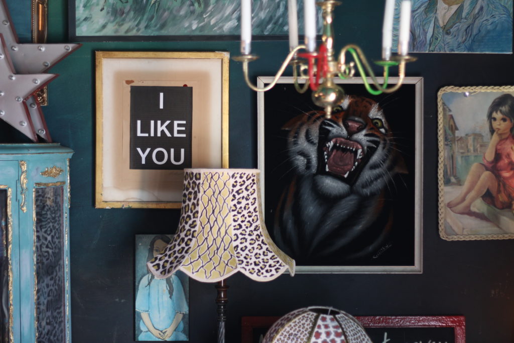 “People can be a bit overwhelmed when they come around for the first time – if it’s horror or delight, I don’t know. It’s Alice in Wonderland meets Jumanji!” she laughs. Back in the living room, with the patio doors out to the garden open and several pieces of painted furniture drying in the sun, ready to be taken to the market later, light pours onto the £5 sofa from Ebay piled with cushions, the mint green sideboard sporting a leopard hand-painted by Marcie, and a pile of clashing lampshades – her latest side project.