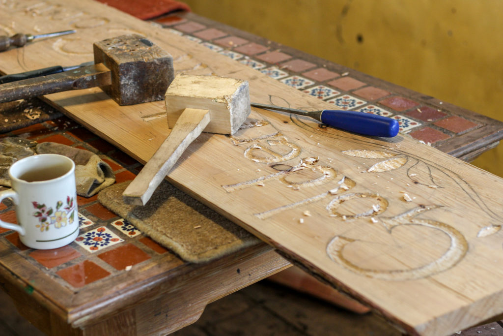 George places the point of his chisel into the pencil-marked surface of a big piece of hemlock, and with two sharp taps the wood curls away like butter. Hunched in a big green overcoat, he is finishing off lettering that spells ‘Golden Hill Community Garden’, while fellow volunteer Maria carves out a sprig of leaves. It’s a new sign for the entrance to the garden, and will hang above the gates at the Spring Fair on May 11. The afternoon of music, merriment and plant sales raises vital funds for the garden, and it’s coming around quickly.