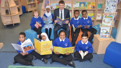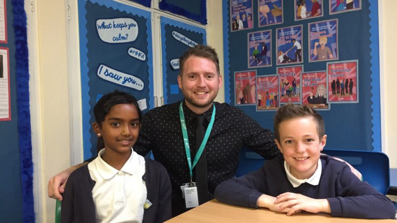 Headteacher Mr Richard Healey with Year Five pupils Danika and Archie
