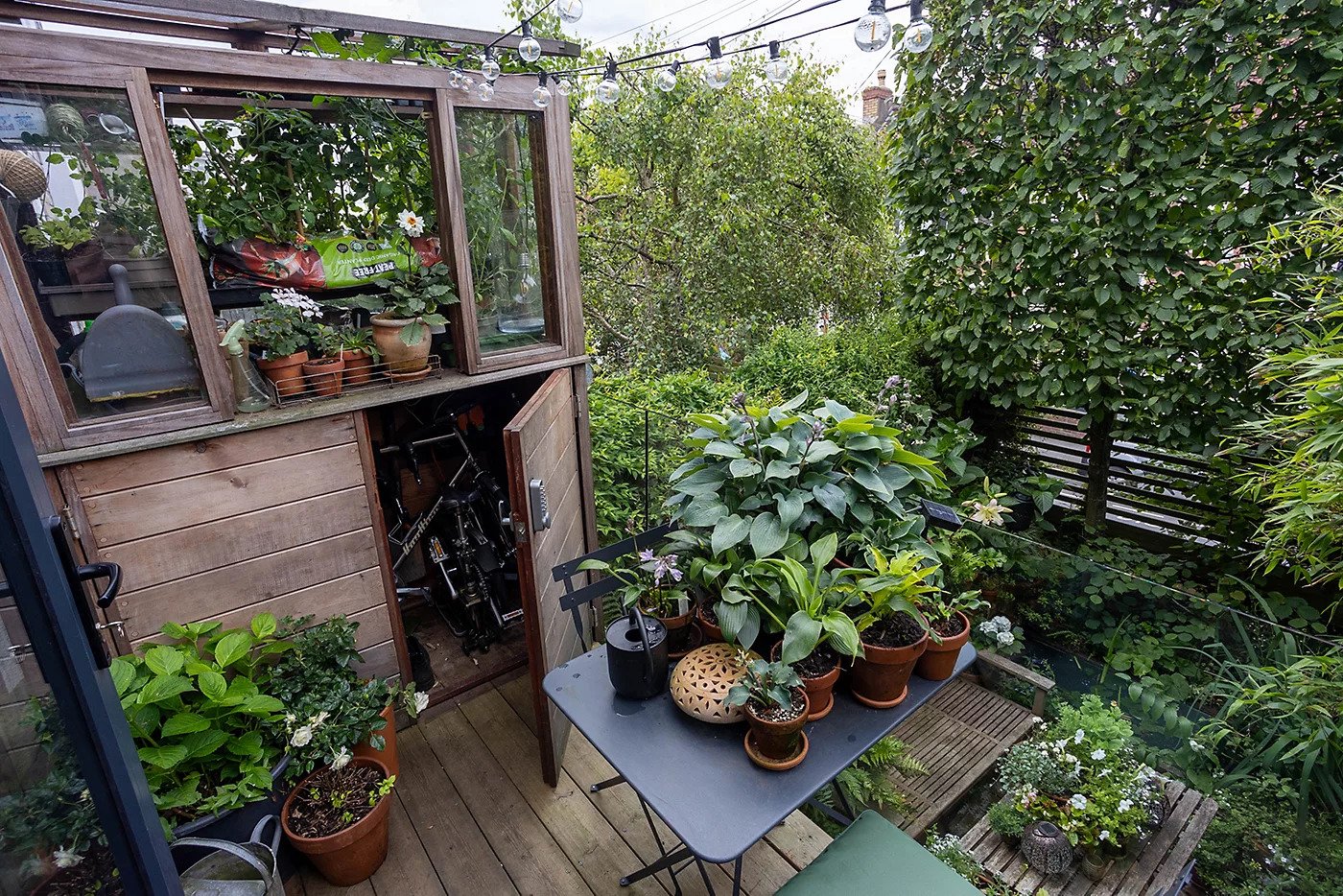 The 5.6m x 6.5 garden encompasses a variety of features, including two entertaining areas, a greenhouse, a pond with a waterfall, bike storage, and a myriad of plants including hydrangeas, hazel bamboo and roses.