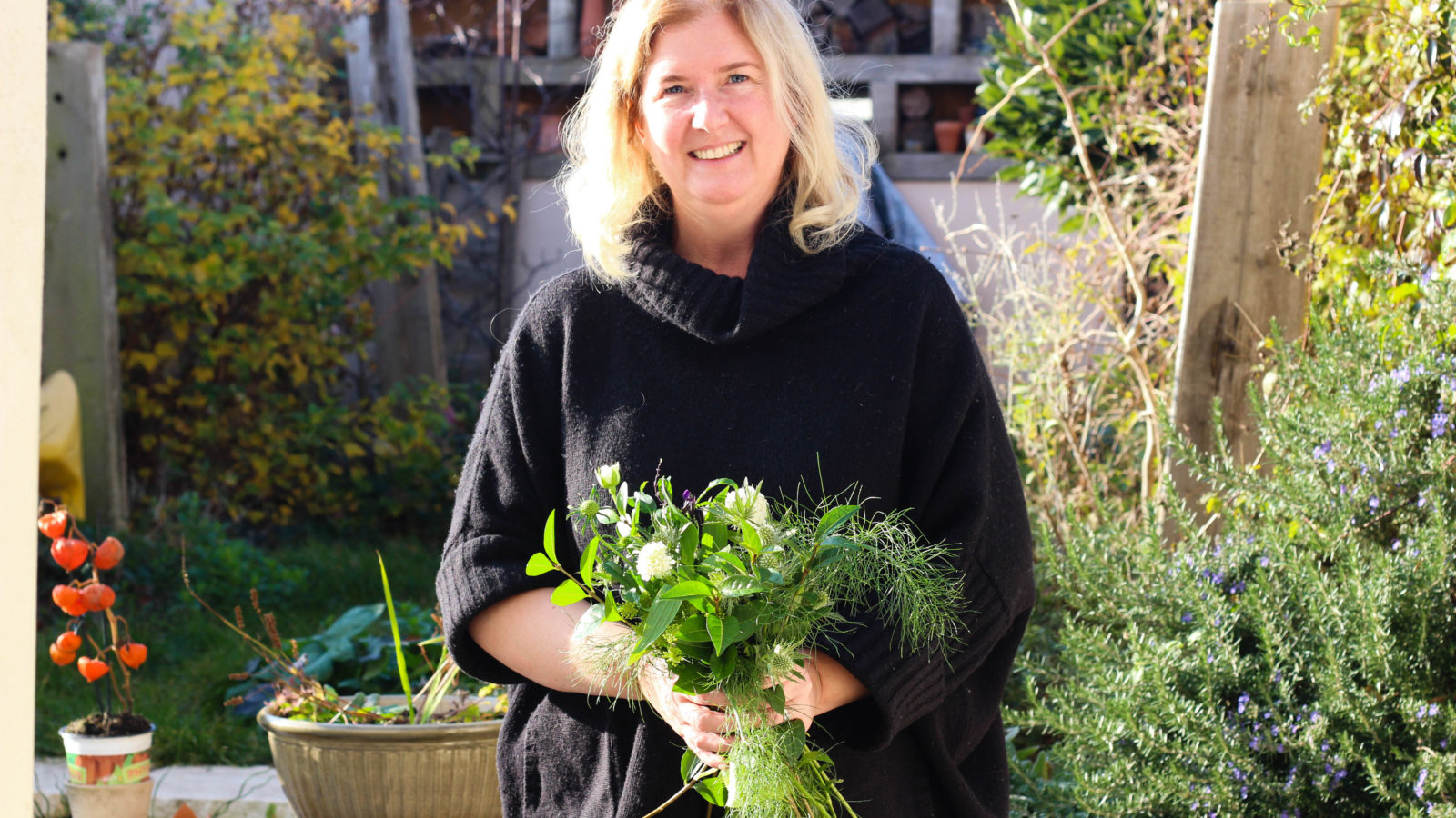 Louise Bastow’s home in Bishopston is warm on a bright November morning. With a beaming smile she welcomes the four members of this morning’s half-day Crafty Gardeners workshop and busies herself making tea in a variety of floral mugs. On the stone floor are three buckets stuffed with flowers and greenery – huge white roses, soft purple anemones, vivid salvias, big cuttings of fennel and privet from the garden, complete with bindweed – along with Munchie the black and white cat, who curls up on the sofa in amongst the coats.