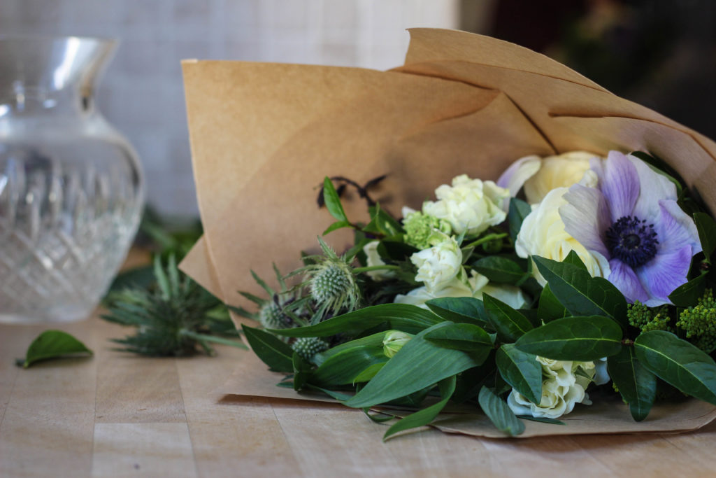 As the two-hour workshop comes to a close, Louise comes around to give her last pearls of wisdom and ties the stems together with brown string. She’s eternally positive, picking out what she likes in the four arrangements that, despite using the same flowers, are all very different from each other. “I really like the teaching side of it because it skills people up to do something,” Louise says. “It’s not difficult but you can make something absolutely beautiful and really personal.” She dashes upstairs to grab some cellophane and brown paper and skilfully wraps each bunch so it’ll survive the trip home.