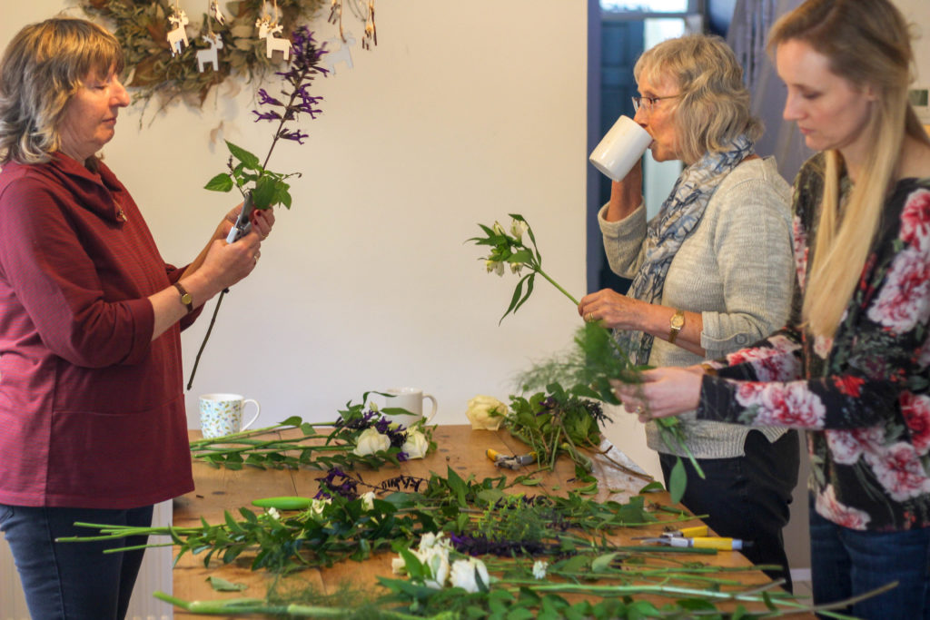 Louise’s kitchen table becomes awash with greenery as the group pick flowers to start their arrangements