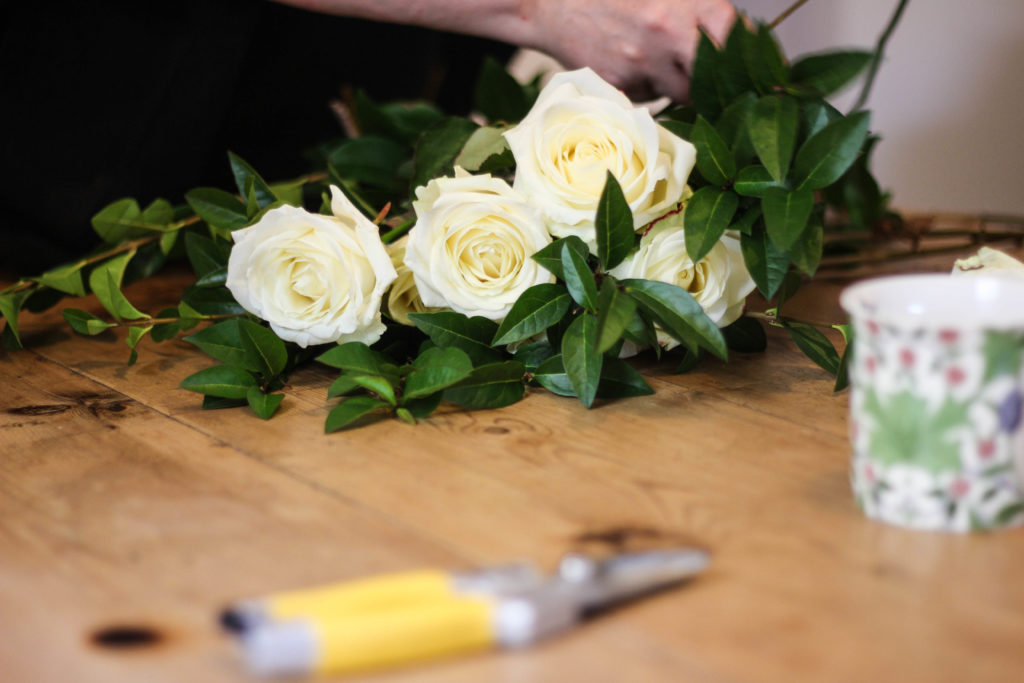 Pairs of yellow secateurs and a groaning plate of chocolate biscuits sit on the big wooden table, and Louise stands at the head of it to demonstrate the main technique of the day: spiralling. She picks up each white rose and removes most of the foliage and any imperfect petals. “Treat them like a vegetable,” is her advice, suggesting we squeeze the backs of their heads to test firmness before buying. Louise demonstrates slowly and carefully, deftly intertwining the stems to create a simple posy and lifting the heads in the centre to create a neat dome. Then it’s our turn to put the skill we’ve just learned to use.