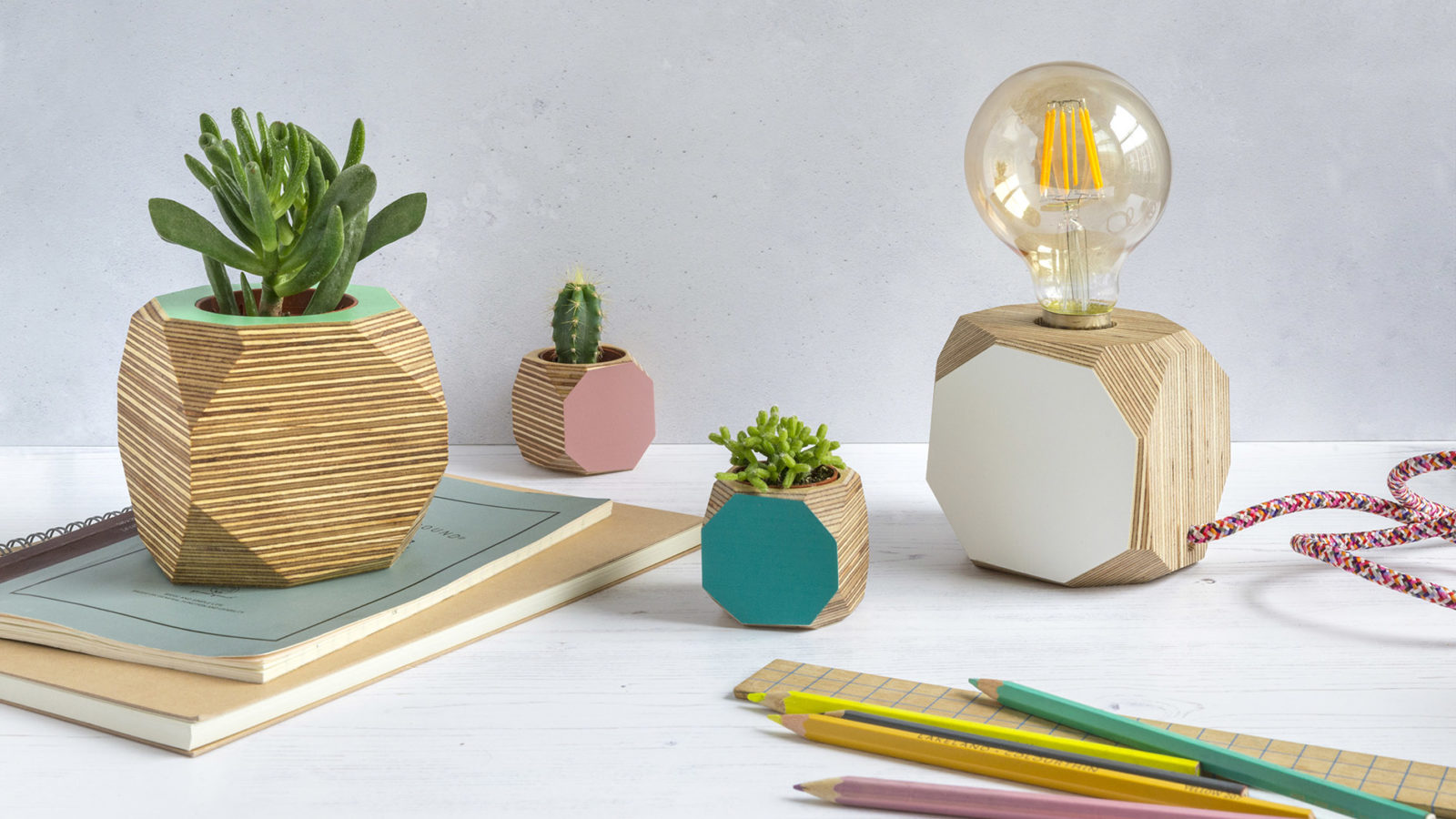 The planters and lights are made from sustainably-sourced plywood and all the products are individually made by hand in Beck’s studio in Bristol.
