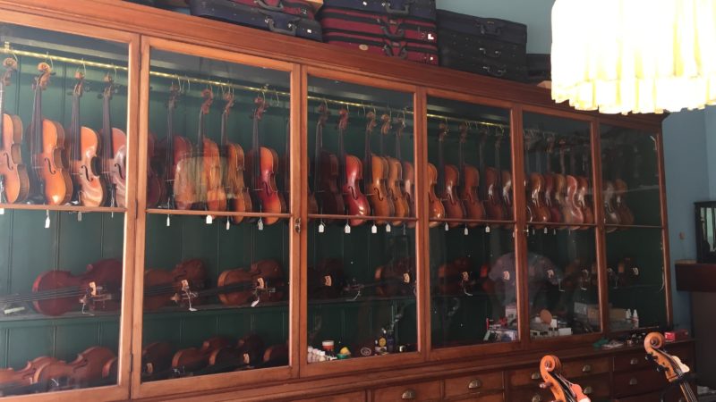 Some of the violins on sale at Cremona House. The cabinets were made in 1879 by original owner George Darbey.