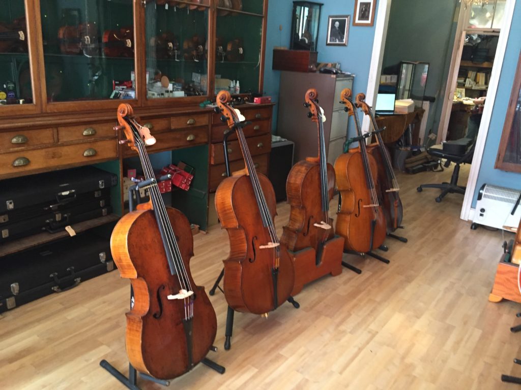 A selection of cellos sold in the shop. The one on the far left dates from 1700 and retails for £70
