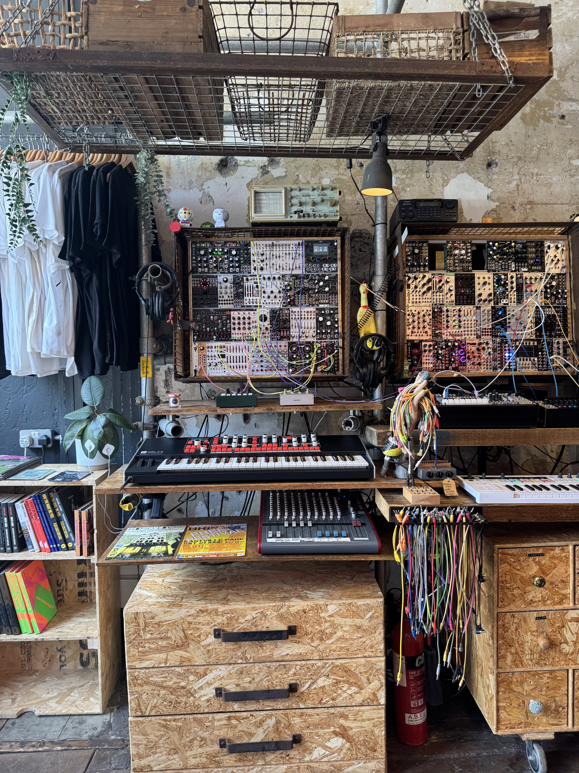 Inside, gadgets abound including synthesizers, modular systems, drum machines, samplers, mixers and more.