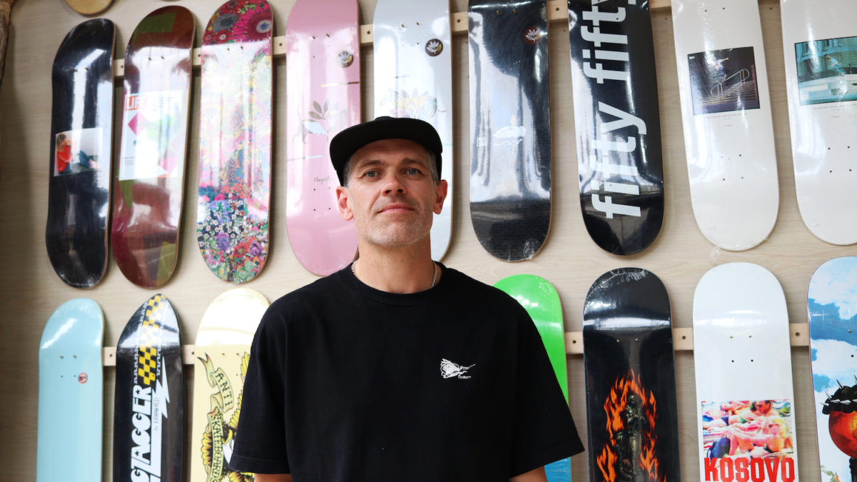 To the right, Syd stands behind the counter. The essence of the golden era of skateboarding exists here, sewn into a new minimalist aesthetic of all-white, brick or wooden surfaces.
