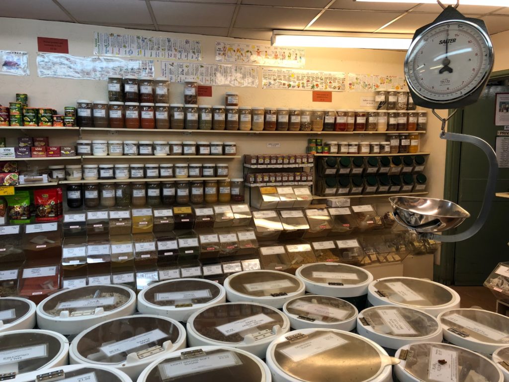 There is a real mixture of people browsing the products on this Thursday morning, forming a diverse clientele. Tim says that a lot of NHS workers and public servants have become regulars over the years. A lot of customers opt for the brown paper bags that hang in clusters around the store to scoop their dry goods, though Tim has noticed more and more people bringing their own reusable containers. “Some people bring their own plastic boxes, others bring glass jars. It’s great to see,” he says.