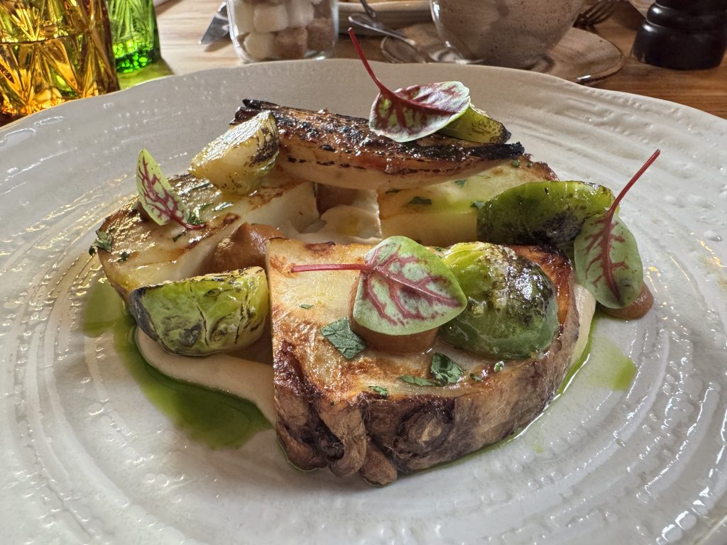 As two vegans, there were plenty on offer, a mushroom soup with fresh farm bread and butter that warmed us up. For mains, we had the celeriac, spiced aubergine, miso glaze onions and charred sprouts. This was followed by a spiced rice pudding, clementine, pear and ginger sorbet and granola. This dinner was easily one of the best we’ve ever had.