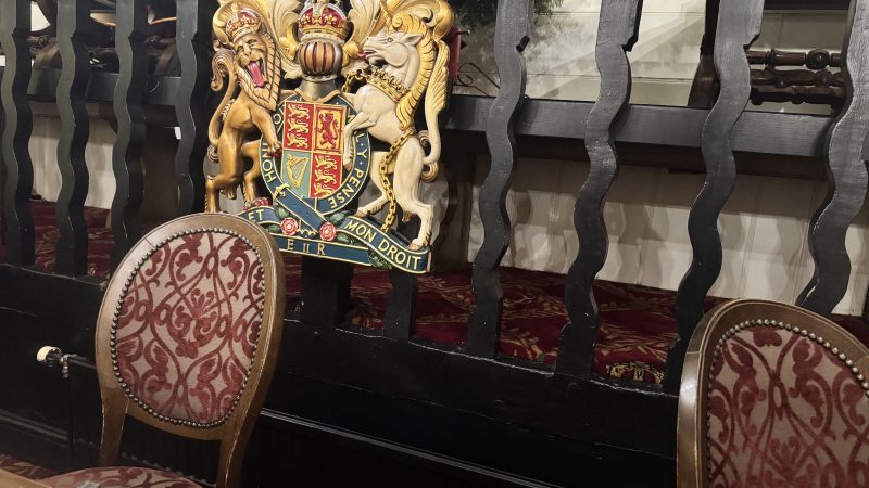 The Verderer’s coat of arms in the court room, now the dining area – photo: Hannah Massoudi