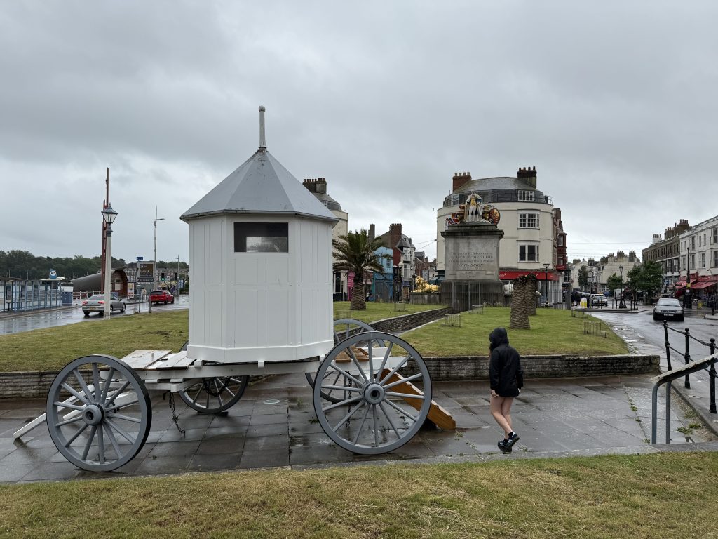 A statue of King George III overlooks a bathing machine which used to transport the monarch into the sea – photo: Martin Booth