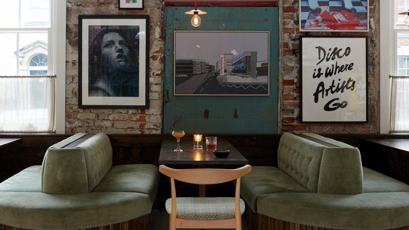 “The smart bar-restaurant inside is all exposed brick with oversized artwork and plush banquettes.